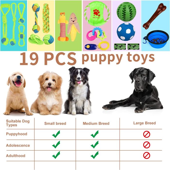 - 💕【 Puppy Teething Chew Toys Set】 – 19-Piece puppy toys, Includes 9-Piece dog rope toys Made of High Quality Polyester Cord, Foldable Travel Dog Bowl, IQ Balls, Bone Molar Stick, Plush puppy dog chew toys, dog training clickerand 2 Extra Poop Bags gifts. Our pet supplies are specially designed suitable for cute puppies and medium breed under 50 lbs, which can meet the different needs of dogs in their daily life.